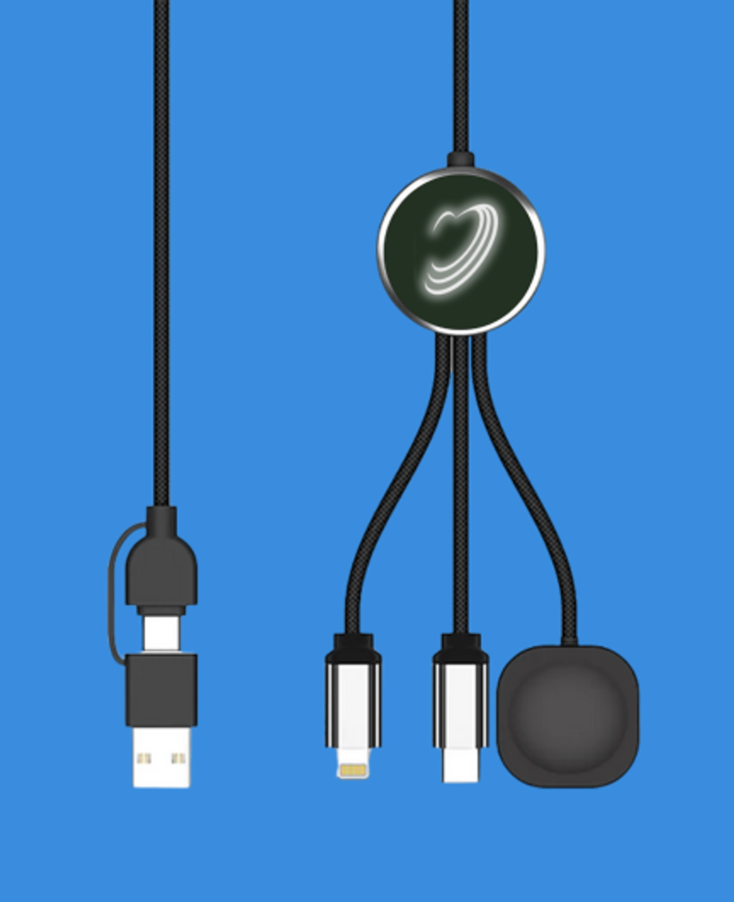 Featuring light up logo display and multiple input/output options, including an apple watch dock! This is a must-have multi cable to keep your devices charged at home and on the go! Each individually packed in retail gift box.